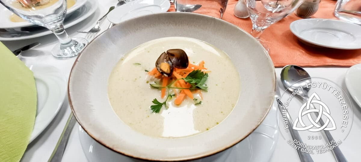 • Előétel: Kókusztejes, zöld curry-s Thai csirkeleves (fekete kagylóval és blansírozott zöldségekkel)